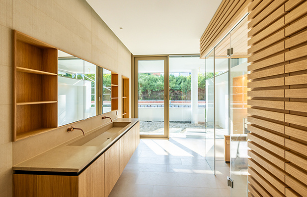 Innen setzt das Haus mit edlen Naturstein- und Parkettböden stilvolle Akzente. Sämtliche Möbel wurden individuell entworfen und gefertigt. Raumhohe Türen unterstreichen das offene Raumkonzept und den modernen Charakter, während der offene Luftraum zwischen Erd- und Obergeschoss ein großzügiges Raumgefühl schafft. Ein Aufzug verbindet alle Ebenen und sorgt für zusätzlichen Komfort. Für Entspannung und Erholung steht den Bewohnern eine komfortable Sauna und ein großzügiger Gartenbereich zur Verfügung.