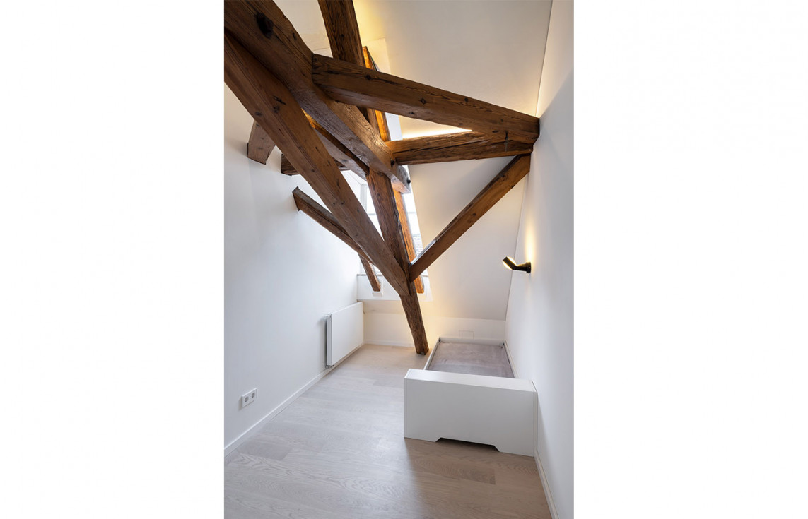 Aus einem dunklen, ungenutzten Dachraum entstanden individuelle, helle Räumlichkeiten, die den historischen Charakter des denkmalgeschützten Ensembles erhalten und erlebbar machen.