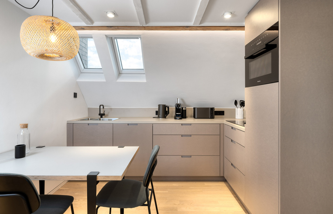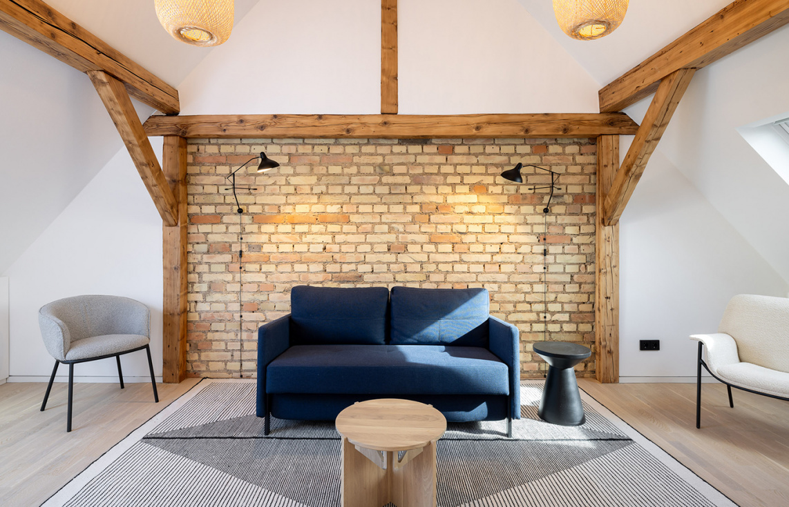 Das denkmalgeschützte Gründerzeithaus aus den Anfängen des 20. Jahrhunderts fällt schon von weitem durch seine prächtige Fassade und seinen gepflegten Erhaltungszustand im Straßenzug auf. Einzig der Dachboden war so, wie man es in den meisten anderen Altbauten ebenso antreffen würde: Dunkel, verwinkelt, staubig, und durch wenig sensible Eingriffe der Vorbesitzer leider total verbaut. Im Ursprungszustand konnte sich kaum jemand vorstellen, dass sich hier sehr gut leben lassen würde. Wir allerdings schon! Nachdem mit Bauamt, Denkmalschutz und Feuerwehr die Rahmenbedingungen für eine Wohnnutzung abgesteckt waren und der Bauherr uns freie Hand bei der Gestaltung gelassen hat, konnten wir uns an die Arbeit machen. Das alte Gebälk, die verwinkelte Struktur und der Ausblick über die Stadt bis zu den ersten Hügeln des Schwarzwaldes haben uns regelrecht inspiriert, hier etwas ganz besonderes zu erschaffen. Das Resultat ist eine feine Zweizimmer-Wohnung, in der man den Altbau-Charme atmen kann. Der sichtbar belassene Dachstuhl, das freigelegte Ziegelmauerwerk, der neue Holzdielenboden, die Farben: alles strahlt Ruhe und Behaglichkeit aus.