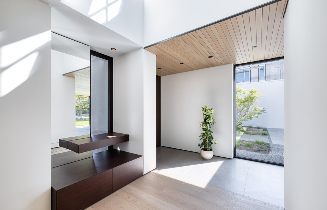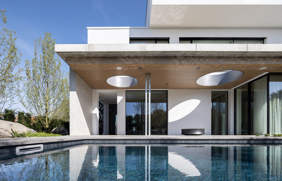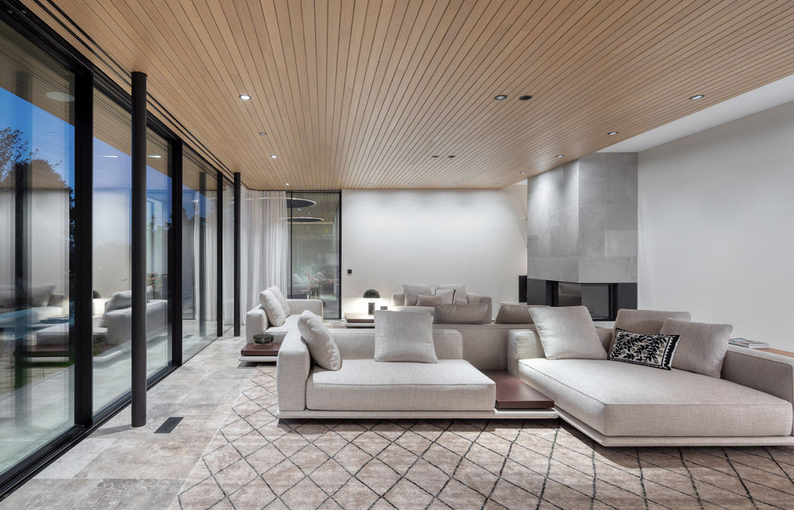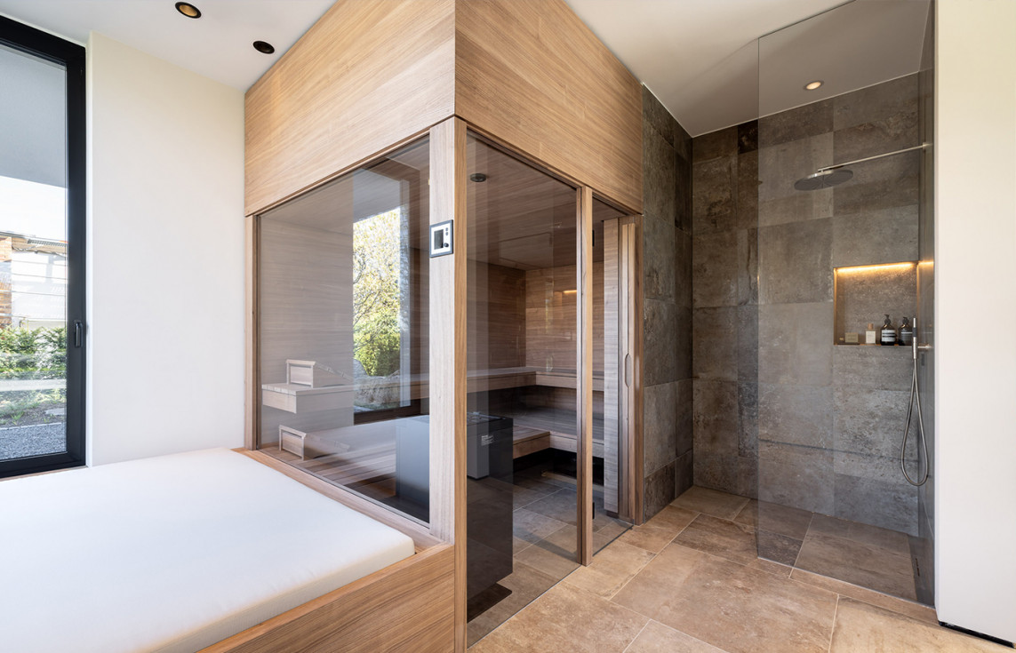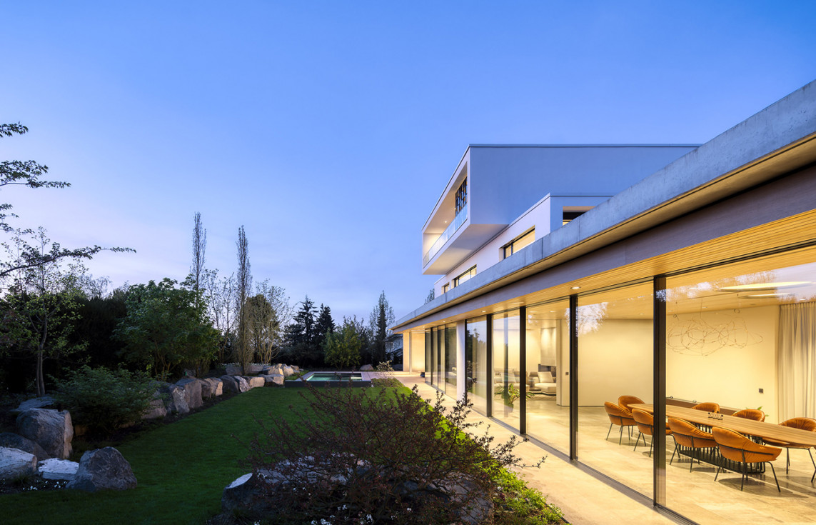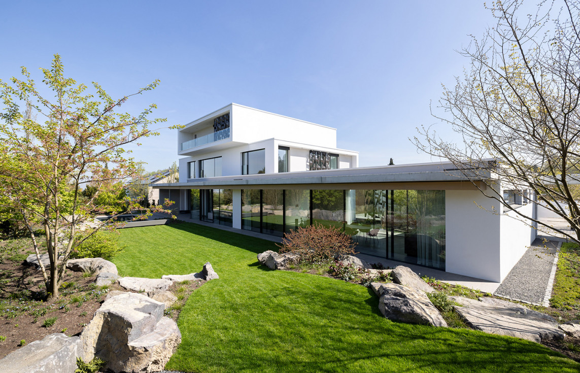 Das großzügige Erdgeschoss gliedert sich funktional in zwei Bereiche: einen offenen Wohn-, Ess- und Küchenbereich sowie eine Einheit mit Einlieger-, Gäste-, Fitness- und Wellnessräumen. Alle erdgeschossigen Räume öffnen sich schwellenlos zum sensibel gestalteten Naturgarten, der sich eng an die Architektur anlehnt. Unterschiedlich große Terrassen zonieren die Außenräume und bieten vom geschützten Innenhof bis zur sonnigen Aussichtsterrasse vielfältige Aufenthaltsqualitäten. Im Zentrum des Gartens liegt der Pool als verbindendes Element zwischen Fitness- und Wellnessbereich. Der großzügige Essbereich lässt sich über großflächige Glasschiebeelemente sowohl zum Garten als auch zum Innenhof vollständig öffnen, so dass sich der Innenraum im Sommer in eine offene Wohnterrasse verwandeln lässt.